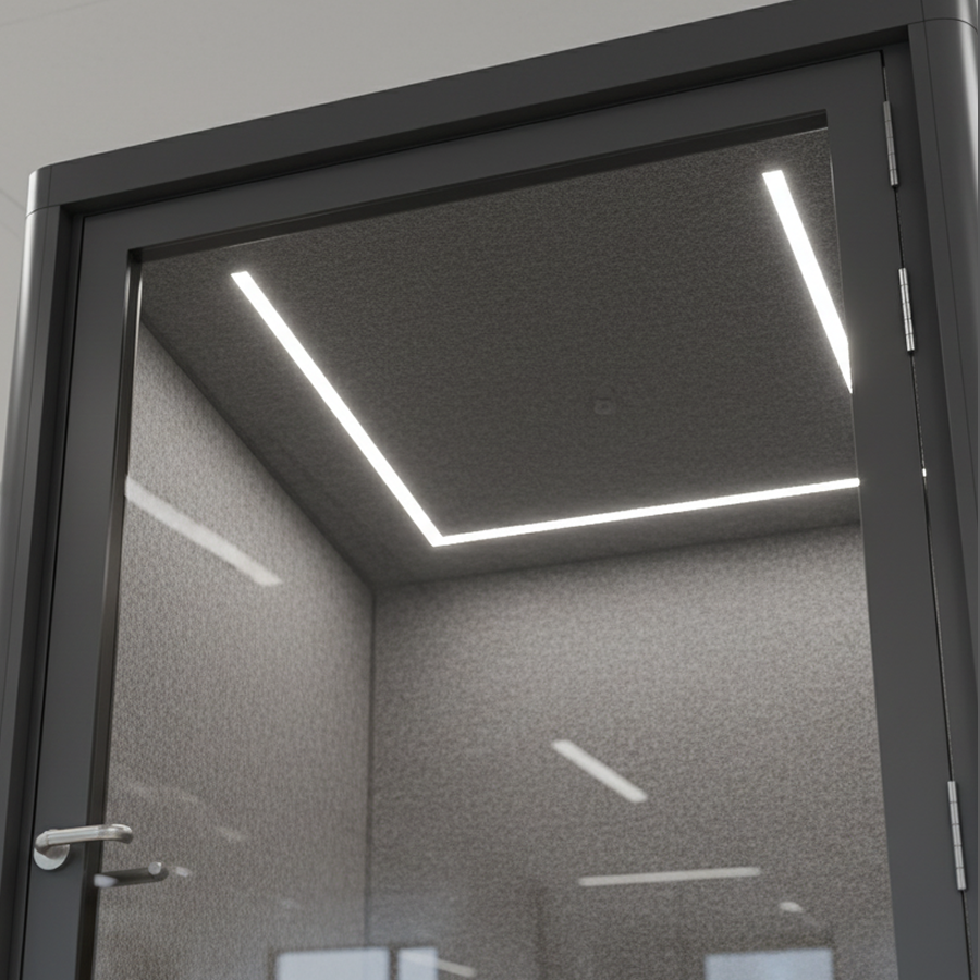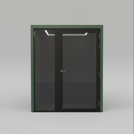 Accommodates 1–8 persons with >32 dB sound insulation, quiet ventilation, and smart LED lighting. Refined finishes and glass detailing create a modern, adaptable acoustic space.