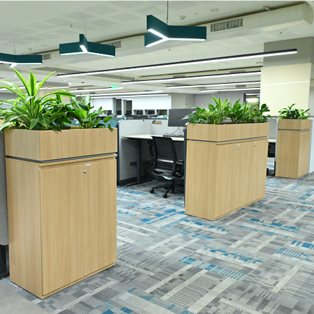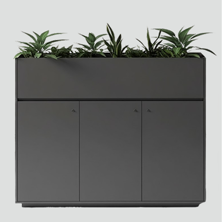 Blends storage and greenery to bring freshness and function to the workspace.