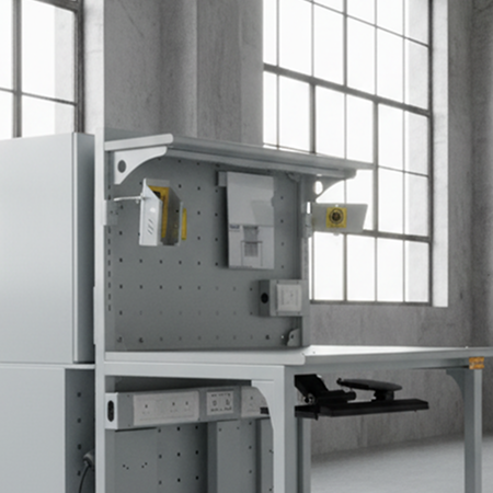Heavy-duty ESD-safe workbench with durable frame, static-dissipative surface, ergonomic modular design, integrated utilities—ideal for electronics, labs, and PCB work.